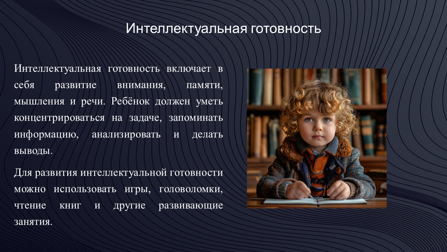 Интеллектуальная готовность включает в себя развитие внимания, памяти, мышления и речи. Ребёнок должен уметь концентрироваться на задаче, запоминать информацию, анализировать и делать выводы.