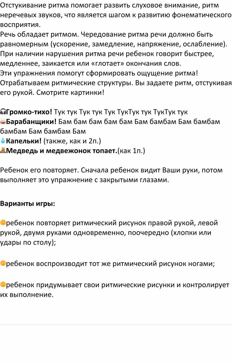 Отстукивание ритма помогает развить слуховое внимание, ритм неречевых звуков, что является шагом к развитию фонематического восприятия.