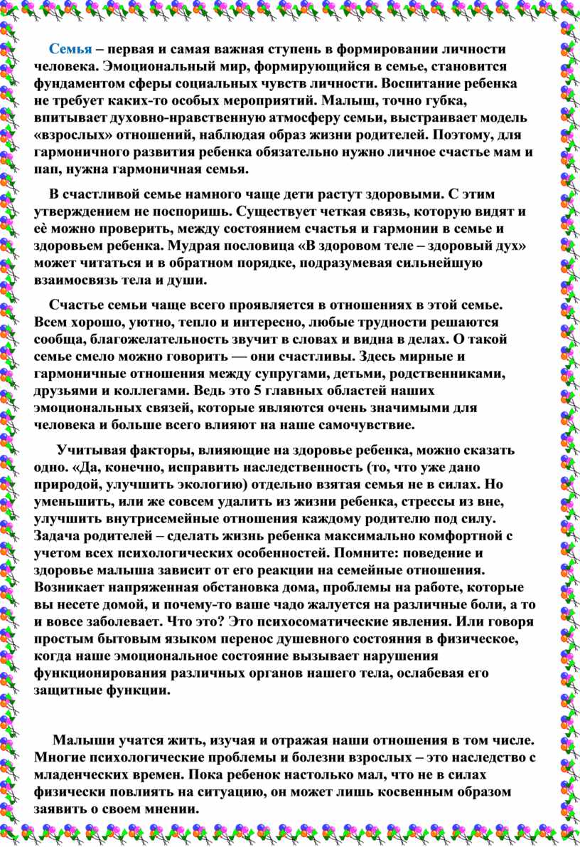 В счастливой семье намного чаще дети растут здоровыми. С этим утверждением не поспоришь. Существует четкая связь, которую видят и еѐ можно проверить, между состоянием счастья и гармонии в семье и здоровьем ребенка. Мудрая пословица «В здоровом теле – здоровый дух» может читаться и в обратном порядке, подразумевая сильнейшую взаимосвязь тела и души.