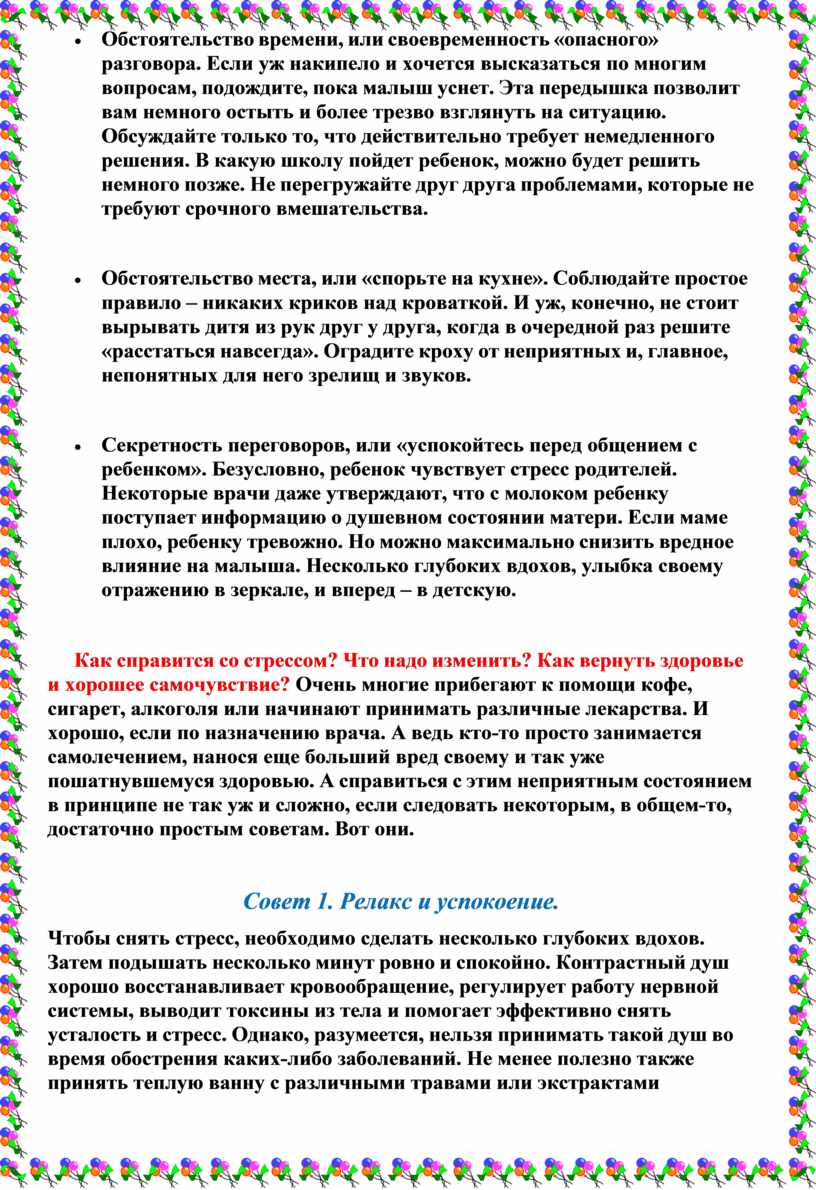 разговора. Если уж накипело и хочется высказаться по многим вопросам, подождите, пока малыш уснет. Эта передышка позволит вам немного остыть и более трезво взглянуть на ситуацию.