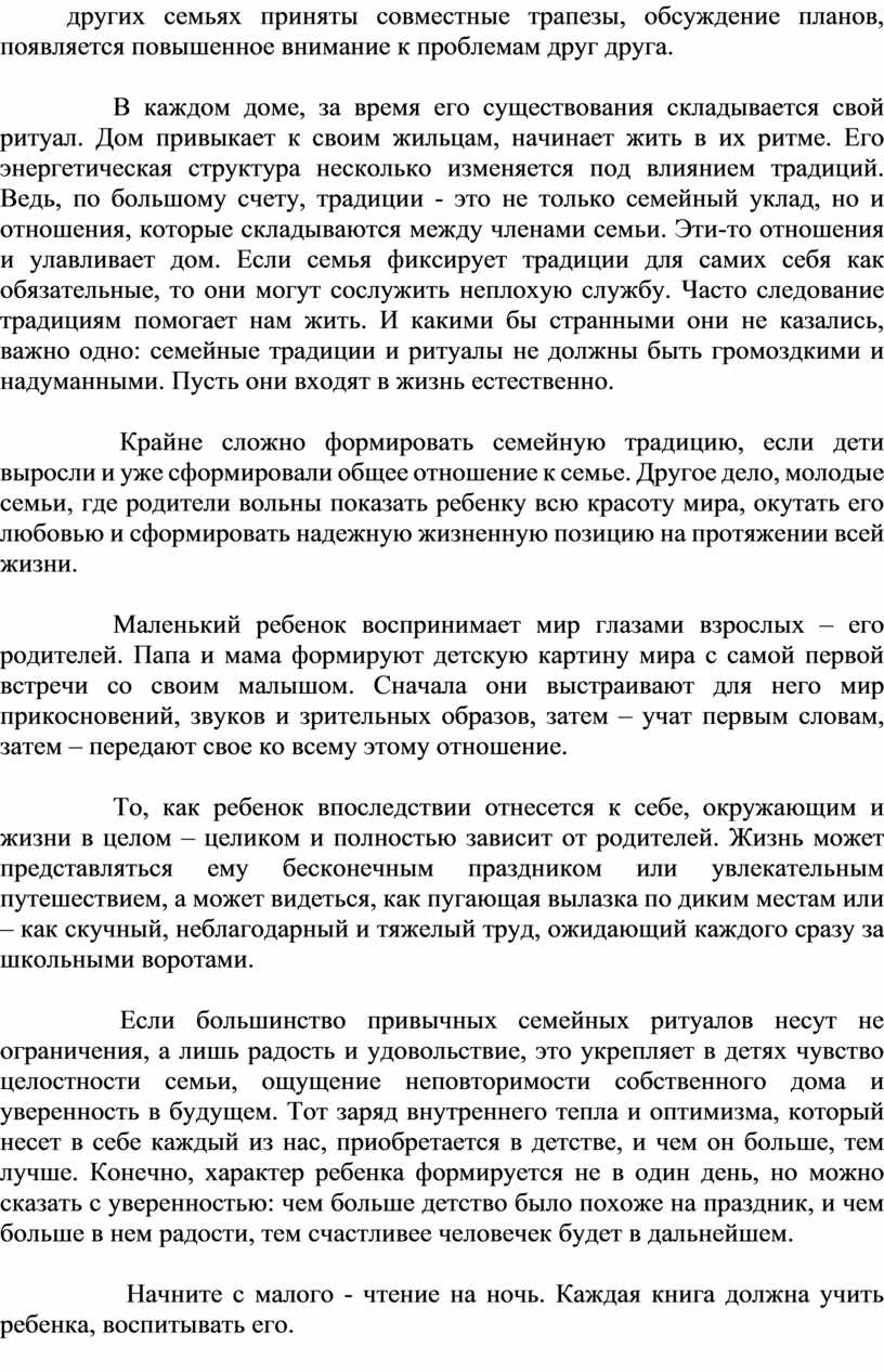 Семейные традиции - это духовная атмосфера дома, которую составляют распорядок дня, обычаи, уклад жизни и привычки его обитателей. Так, одни семьи предпочитают рано подниматься, завтракать на скорую руку, уходить на работу и встречаться вечером без расспросов и разговоров. В других семьях приняты совместные трапезы, обсуждение планов, появляется повышенное внимание к проблемам друг друга.