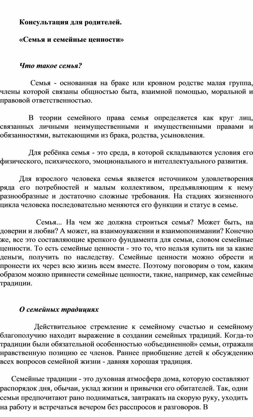 Действительное стремление к семейному счастью и семейному благополучию находит выражение в создании семейных традиций. Когда-то традиции были обязательной особенностью «объединенной» семьи, отражали нравственную позицию ее членов. Раннее приобщение детей к обсуждению всех вопросов семейной жизни - давняя хорошая традиция.