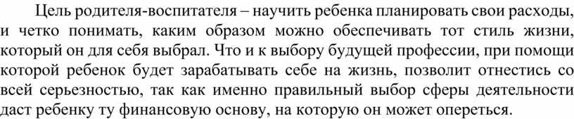 Цель родителя-воспитателя – научить ребенка планировать свои расходы, и четко понимать, каким образом можно обеспечивать тот стиль жизни, который он для себя выбрал. Что и к выбору будущей профессии, при помощи которой ребенок будет зарабатывать себе на жизнь, позволит отнестись со всей серьезностью, так как именно правильный выбор сферы деятельности даст ребенку ту финансовую основу, на которую он может опереться.