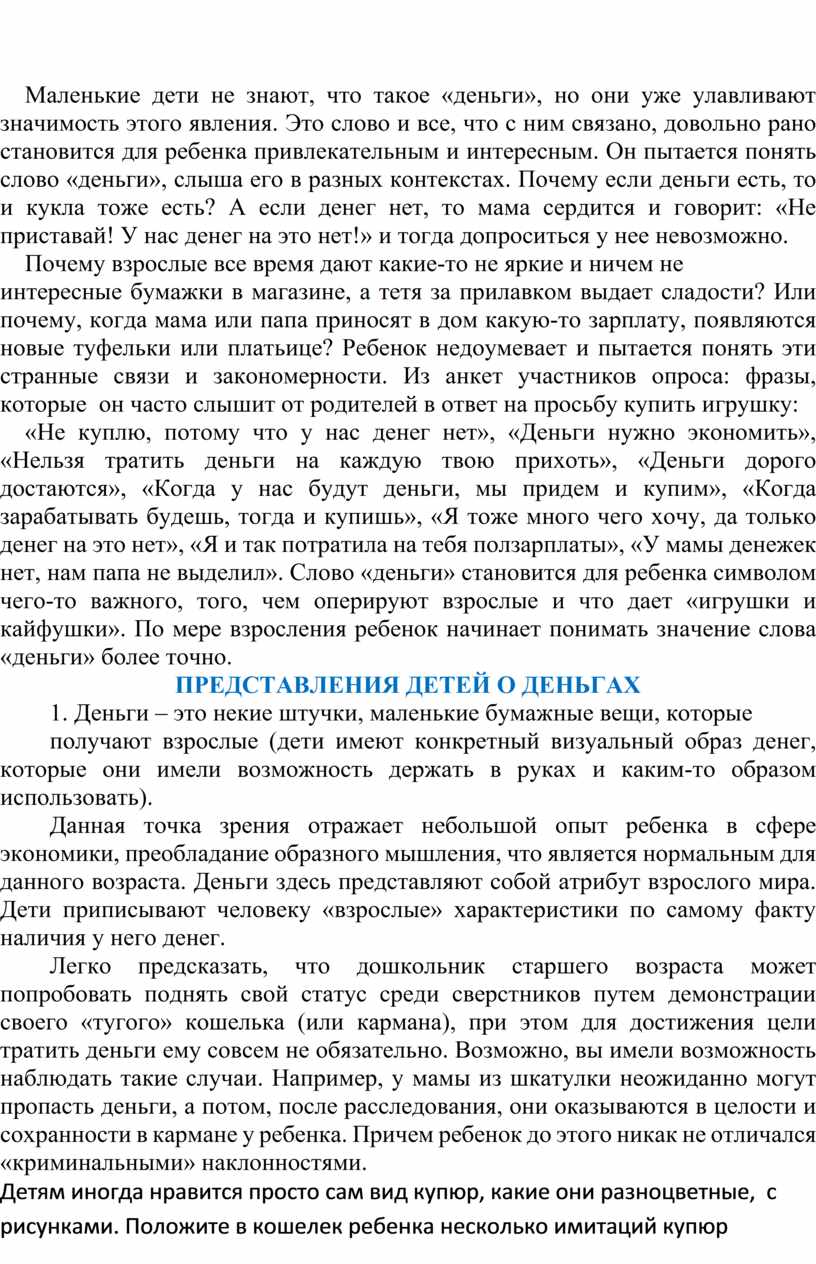 ПРЕДСТАВЛЕНИЯ ДЕТЕЙ О ДЕНЬГАХ
