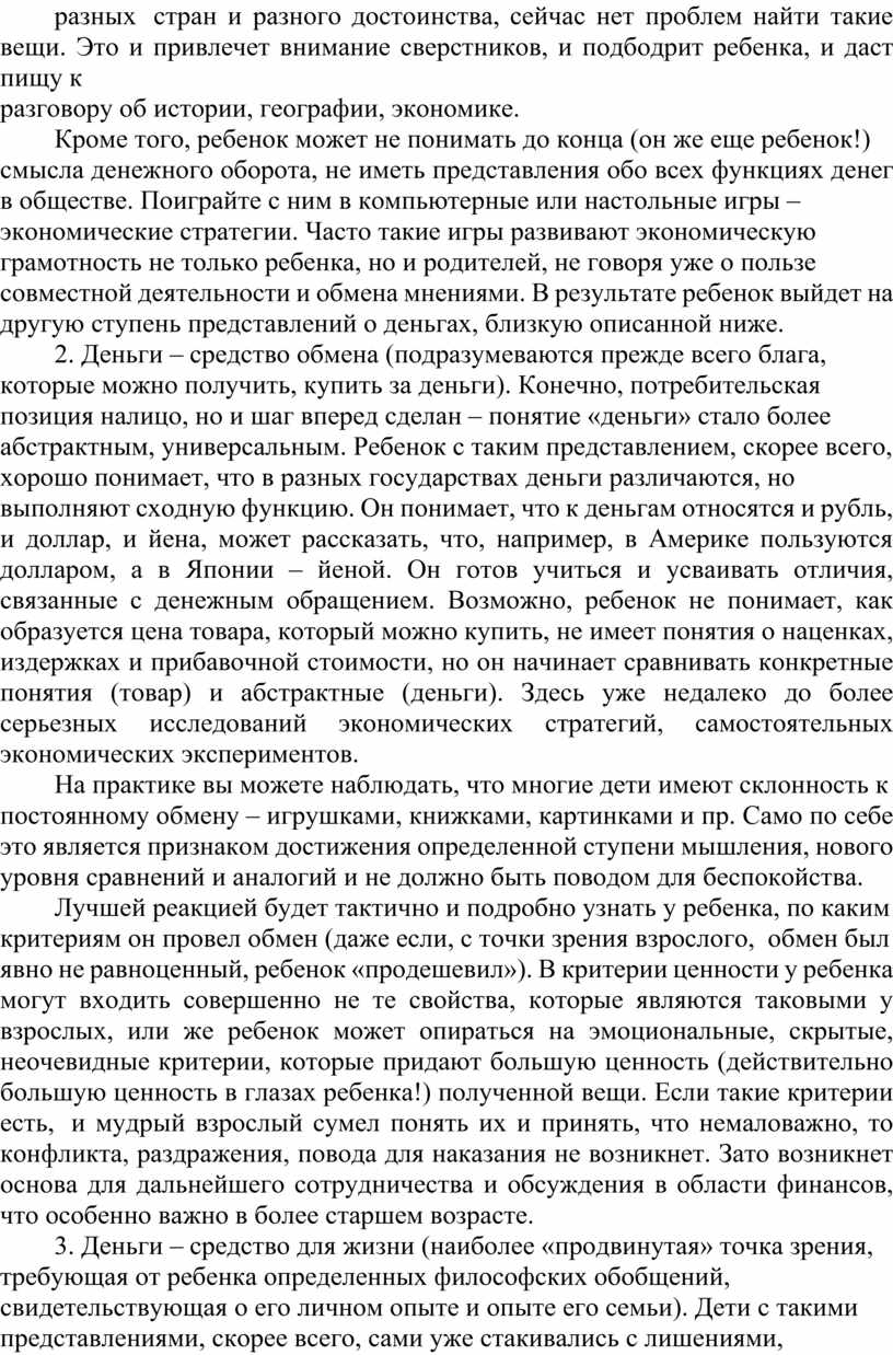 выполняют сходную функцию. Он понимает, что к деньгам относятся и рубль, и доллар, и йена, может рассказать, что, например, в Америке пользуются долларом, а в Японии – йеной. Он готов учиться и усваивать отличия, связанные с денежным обращением. Возможно, ребенок не понимает, как образуется цена товара, который можно купить, не имеет понятия о наценках, издержках и прибавочной стоимости, но он начинает сравнивать конкретные понятия (товар) и абстрактные (деньги). Здесь уже недалеко до более серьезных исследований экономических стратегий, самостоятельных экономических экспериментов.