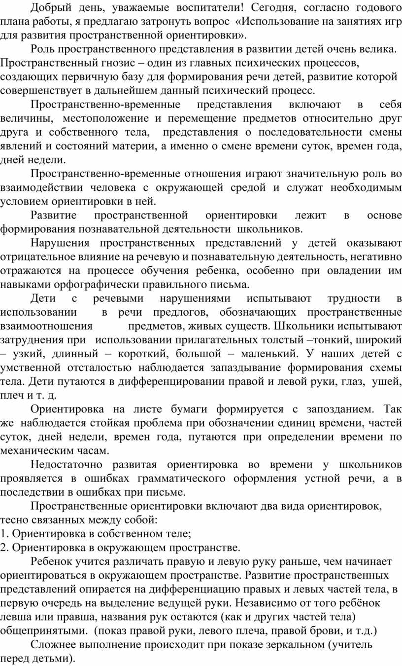 Добрый день, уважаемые воспитатели! Сегодня, согласно годового плана работы, я предлагаю затронуть вопрос «Использование на занятиях игр для развития пространственной ориентировки».