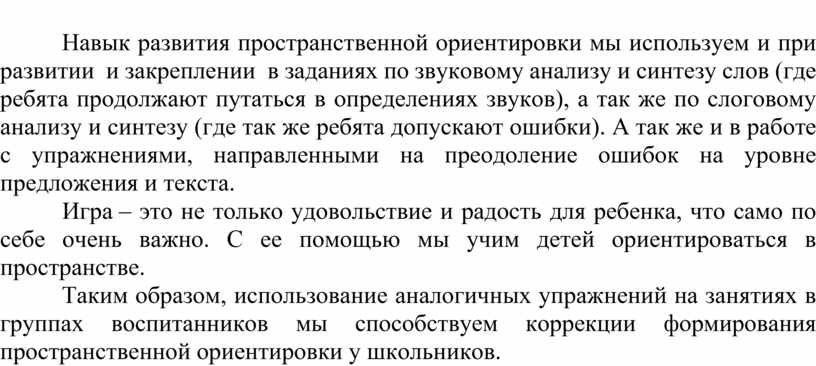 Нарушения пространственных представлений у детей оказывают отрицательное влияние на речевую и познавательную деятельность, негативно отражаются на процессе обучения ребенка, особенно при овладении им навыками орфографически правильного письма.