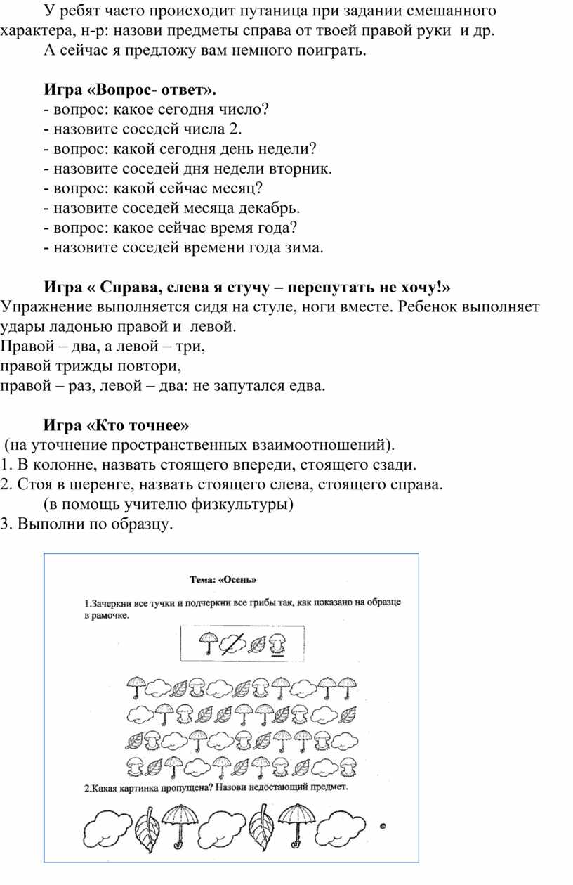 У ребят часто происходит путаница при задании смешанного характера, н-р: назови предметы справа от твоей правой руки и др.