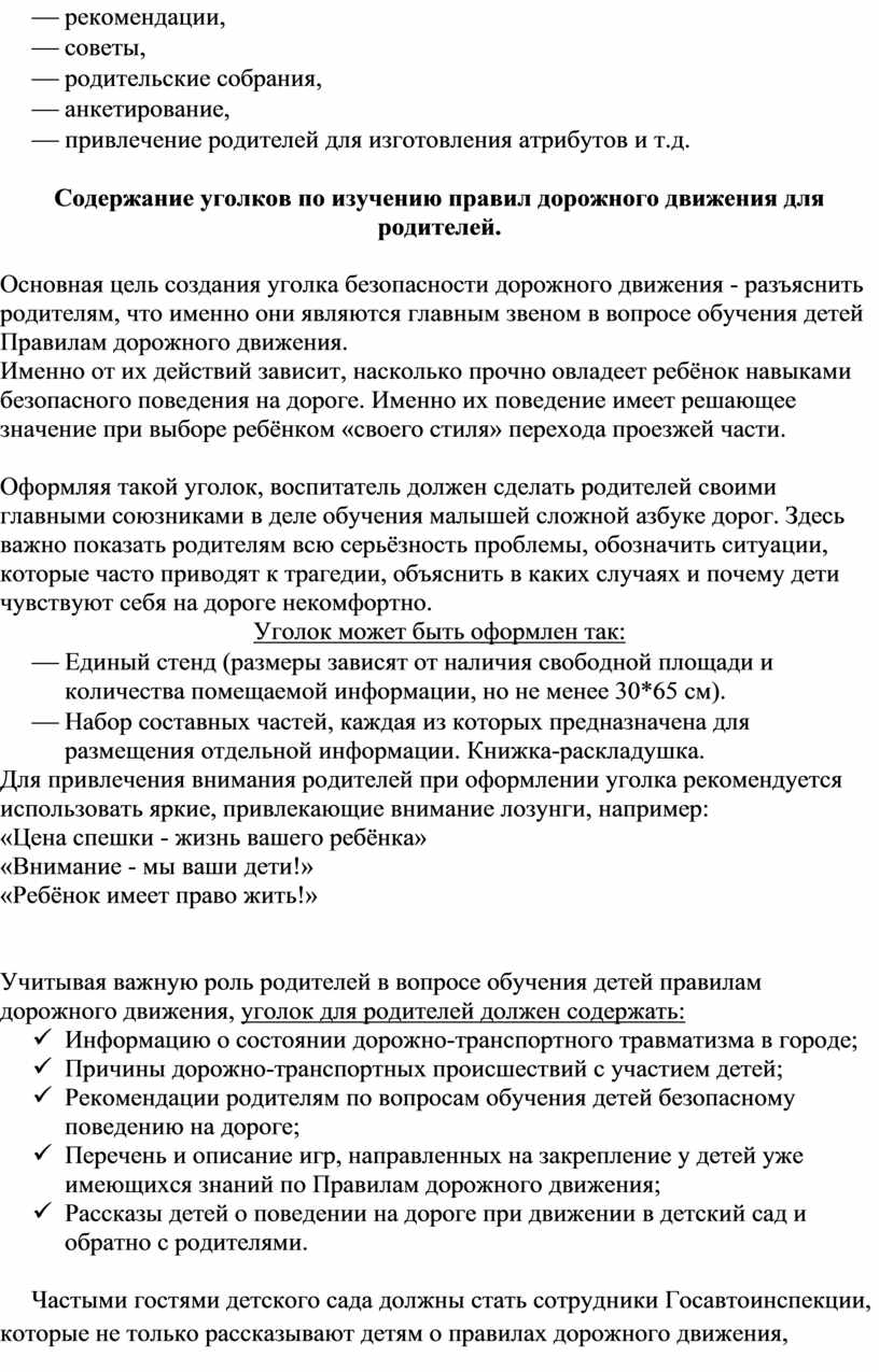 Содержание уголков по изучению правил дорожного движения для родителей.