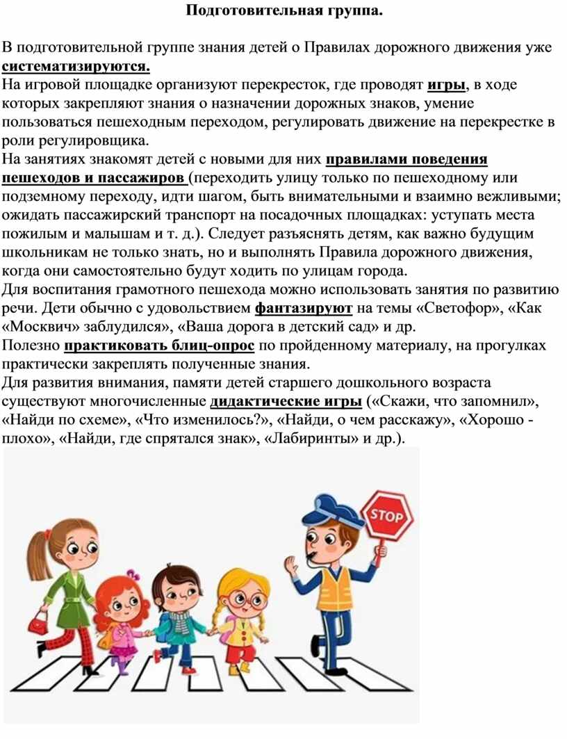 На занятиях знакомят детей с новыми для них правилами поведения пешеходов и пассажиров (переходить улицу только по пешеходному или подземному переходу, идти шагом, быть внимательными и взаимно вежливыми; ожидать пассажирский транспорт на посадочных площадках: уступать места пожилым и малышам и т. д.). Следует разъяснять детям, как важно будущим школьникам не только знать, но и выполнять Правила дорожного движения, когда они самостоятельно будут ходить по улицам города.