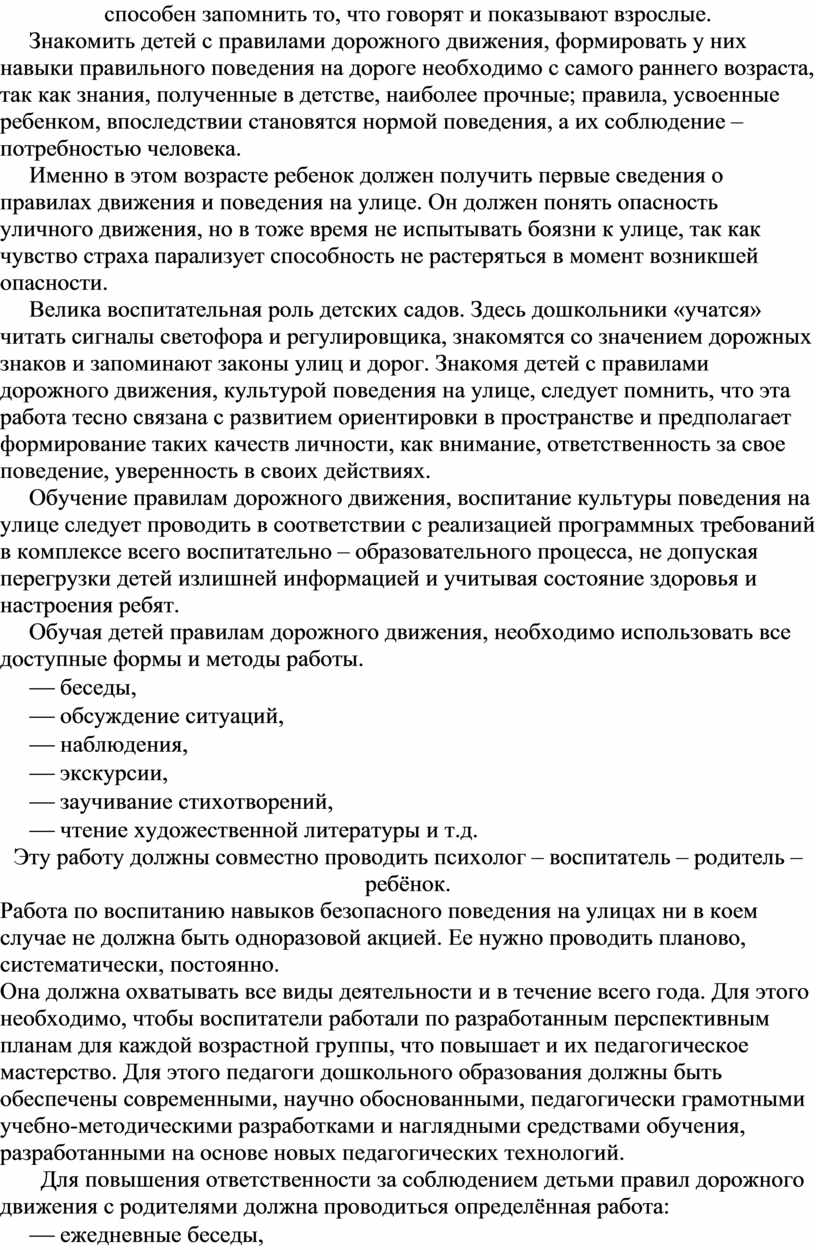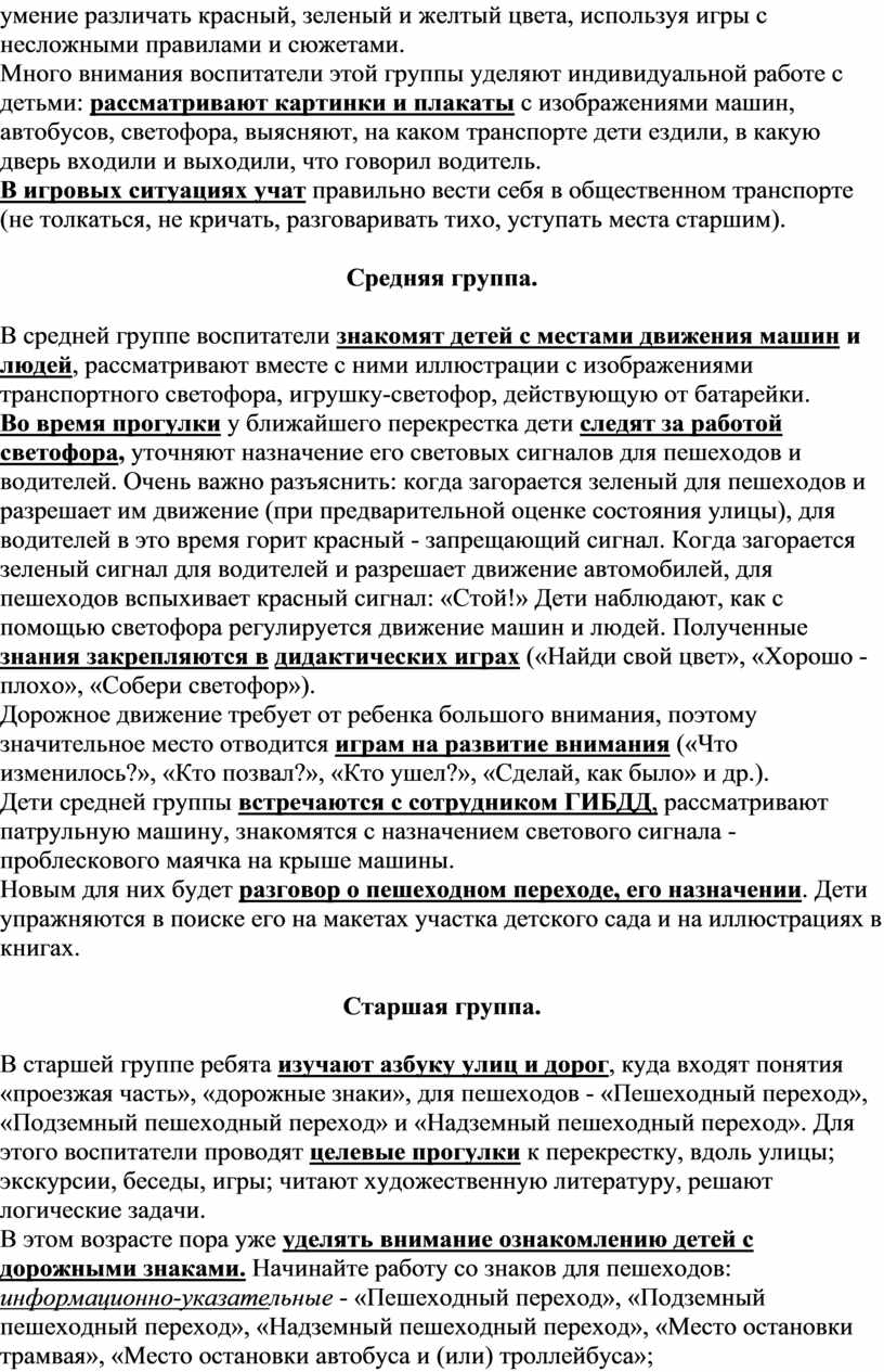 Обучение правилам дорожного движения, воспитание культуры поведения на улице следует проводить в соответствии с реализацией программных требований в комплексе всего воспитательно – образовательного процесса, не допуская перегрузки детей излишней информацией и учитывая состояние здоровья и настроения ребят.