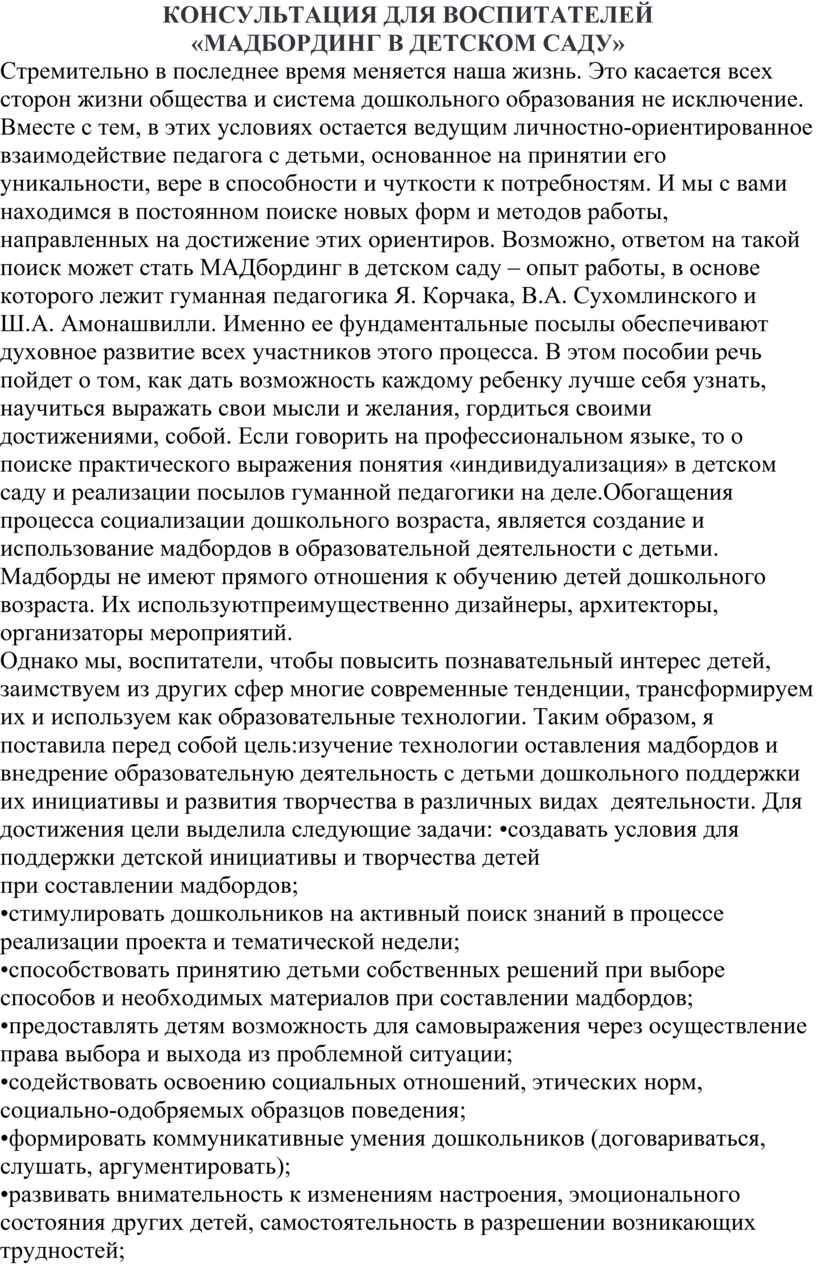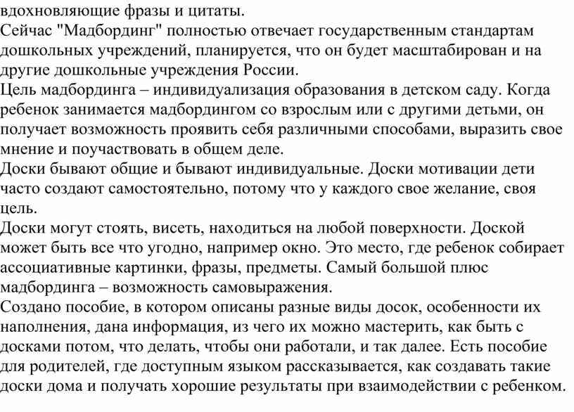 Стремительно в последнее время меняется наша жизнь. Это касается всех сторон жизни общества и система дошкольного образования не исключение. Вместе с тем, в этих условиях остается ведущим личностно-ориентированное взаимодействие педагога с детьми, основанное на принятии его уникальности, вере в способности и чуткости к потребностям. И мы с вами находимся в постоянном поиске новых форм и методов работы, направленных на достижение этих ориентиров. Возможно, ответом на такой поиск может стать МАДбординг в детском саду – опыт работы, в основе которого лежит гуманная педагогика Я. Корчака, В.А. Сухомлинского и Ш.А. Амонашвилли. Именно ее фундаментальные посылы обеспечивают духовное развитие всех участников этого процесса. В этом пособии речь пойдет о том, как дать возможность каждому ребенку лучше себя узнать, научиться выражать свои мысли и желания, гордиться своими достижениями, собой. Если говорить на профессиональном языке, то о поиске практического выражения понятия «индивидуализация» в детском саду и реализации посылов гуманной педагогики на деле.Обогащения процесса социализации дошкольного возраста, является создание и использование мадбордов в образовательной деятельности с детьми. Мадборды не имеют прямого отношения к обучению детей дошкольного возраста. Их используютпреимущественно дизайнеры, архитекторы, организаторы мероприятий.