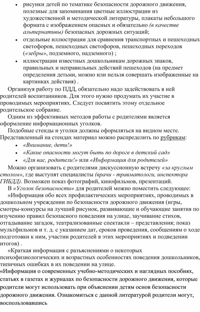 «Информация обо всех профилактических мероприятиях, проводимых в дошкольном учреждении по безопасности дорожного движения (игры, смотры-конкурсы на лучший рисунок, развивающие и обучающие занятия по изучению правил безопасного поведения на улице, заучивание стихов, отгадывание загадок, театрализованные спектакли – представления; показ мультфильмов и т. д. с указанием дат, сроков проведения, сообщениям о ходе подготовки к ним, участии родителей в этих мероприятиях и подведении итогов) .