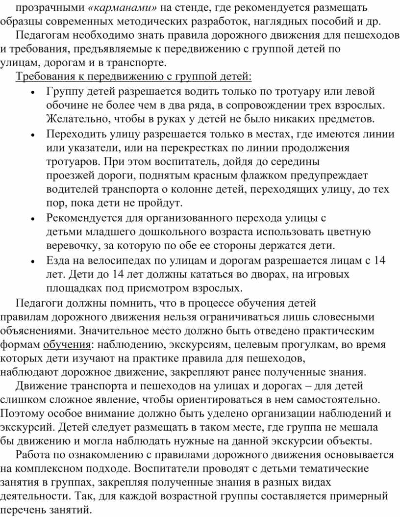 Педагогам необходимо знать правила дорожного движения для пешеходов и требования, предъявляемые к передвижению с группой детей по улицам, дорогам и в транспорте. Педагоги должны помнить, что в процессе обучения детей правилам дорожного движения нельзя ограничиваться лишь словесными объяснениями. Значительное место должно быть отведено практическим формам обучения: наблюдению, экскурсиям, целевым прогулкам, во время которых дети изучают на практике правила для пешеходов, наблюдают дорожное движение, закрепляют раннее полученные знания. Целесообразно также организовать обсуждение возможных опасных ситуаций, привлекая личный опыт детей, случаи из жизни.