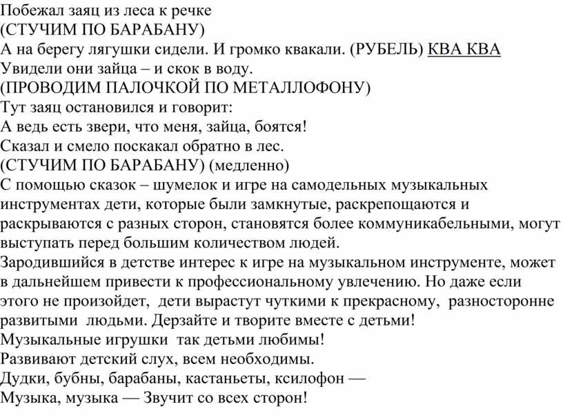 При озвучивании сказки или стихотворений с детьми 2 – 3 лет, педагог первое время играет на шумовых инструментах сам.