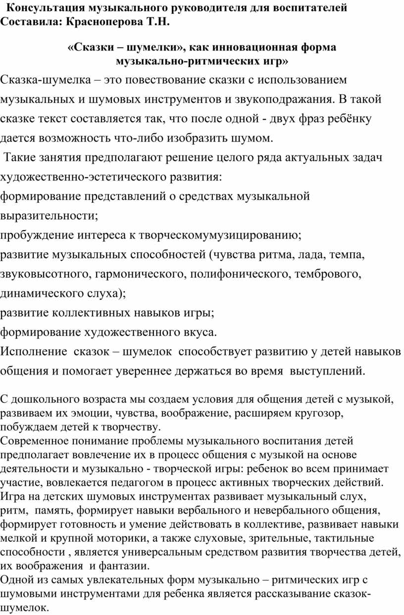 Исполнение сказок – шумелок способствует развитию у детей навыков общения и помогает увереннее держаться во время выступлений. Звукоподражание на шумовых инструментах, с различной динамикой и темпом развивает у детей творческую фантазию, обучает способам и приемам игры на детских музыкальных инструментах.