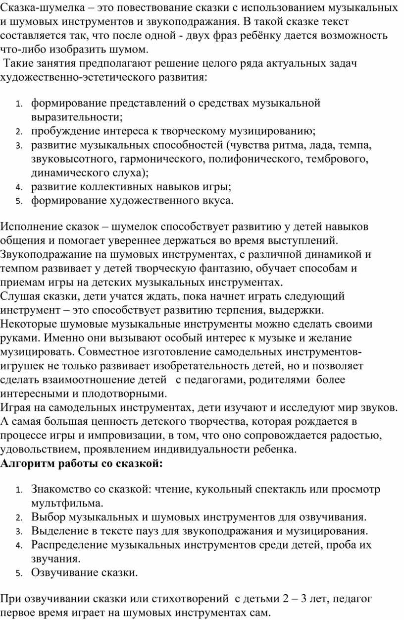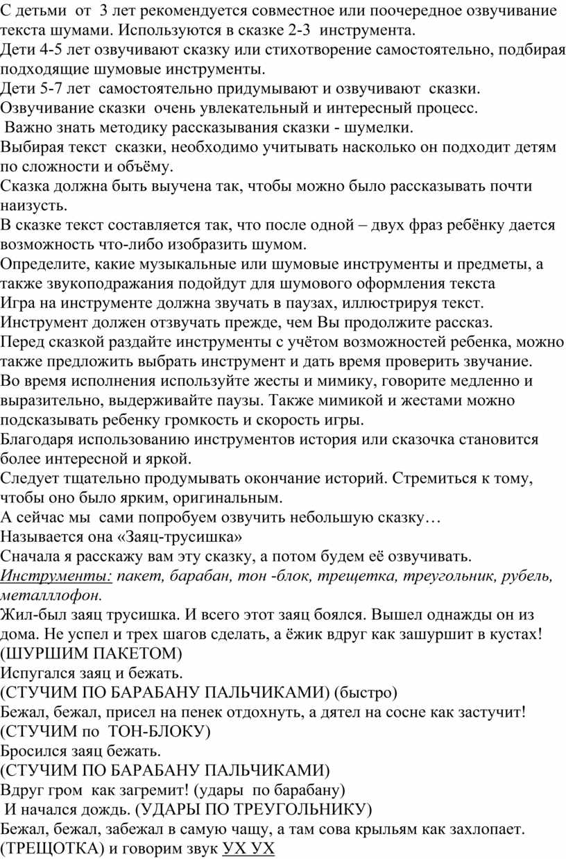 С детьми от 3 лет рекомендуется совместное или поочередное озвучивание текста шумами. Используются в сказке 2-3 инструмента.