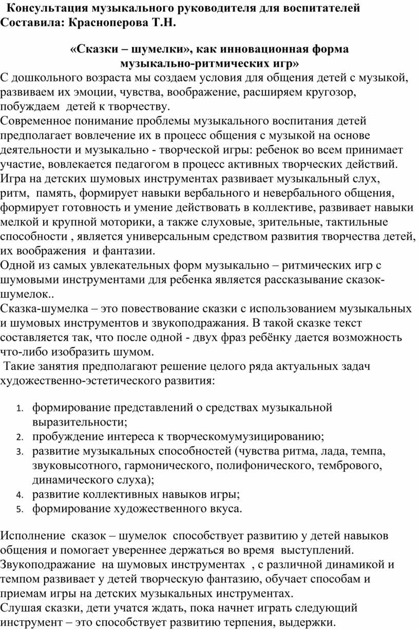 Исполнение сказок – шумелок способствует развитию у детей навыков общения и помогает увереннее держаться во время выступлений. Звукоподражание на шумовых инструментах , с различной динамикой и темпом развивает у детей творческую фантазию, обучает способам и приемам игры на детских музыкальных инструментах.
