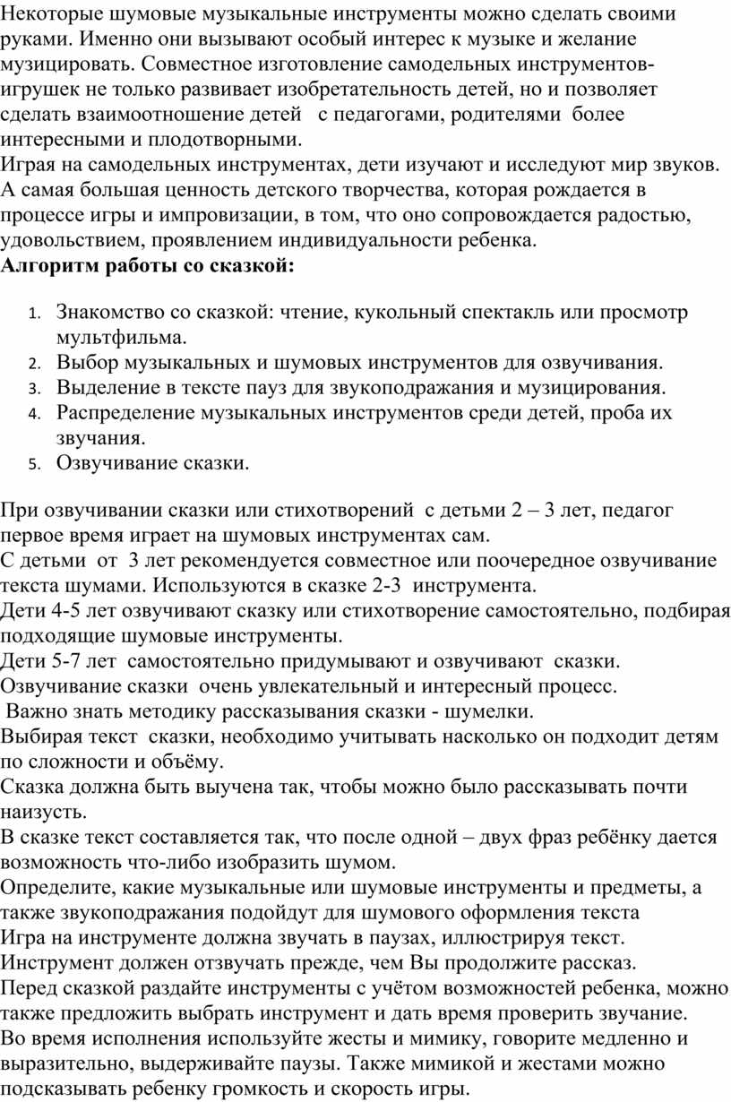 С детьми от 3 лет рекомендуется совместное или поочередное озвучивание текста шумами. Используются в сказке 2-3 инструмента.