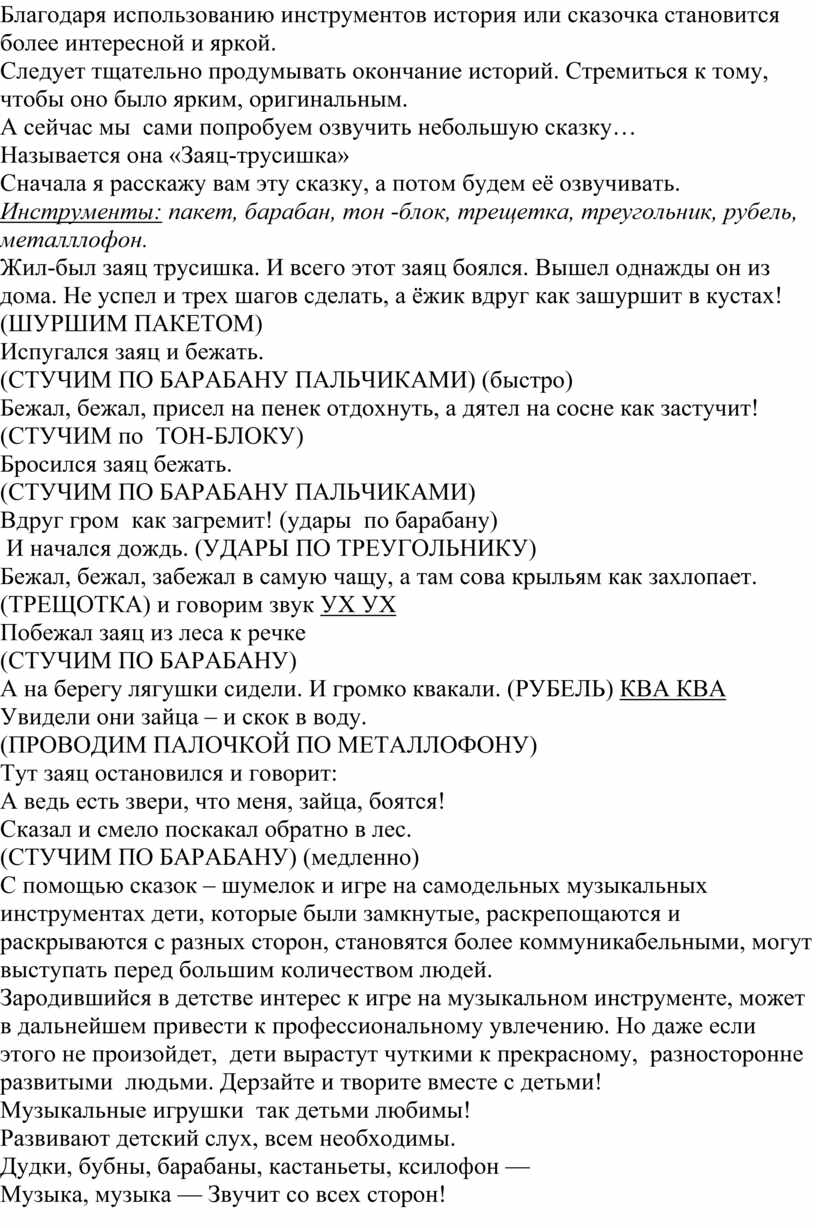 При озвучивании сказки или стихотворений с детьми 2 – 3 лет, педагог первое время играет на шумовых инструментах сам.