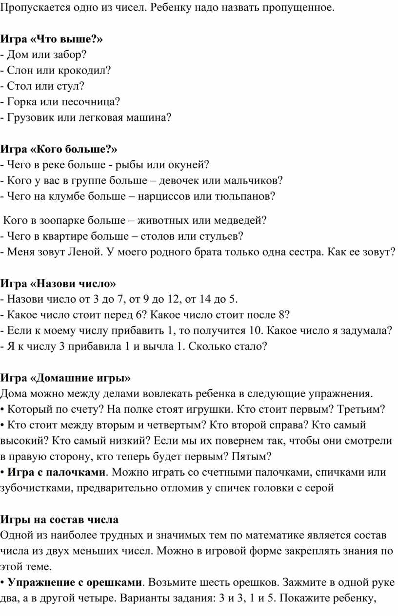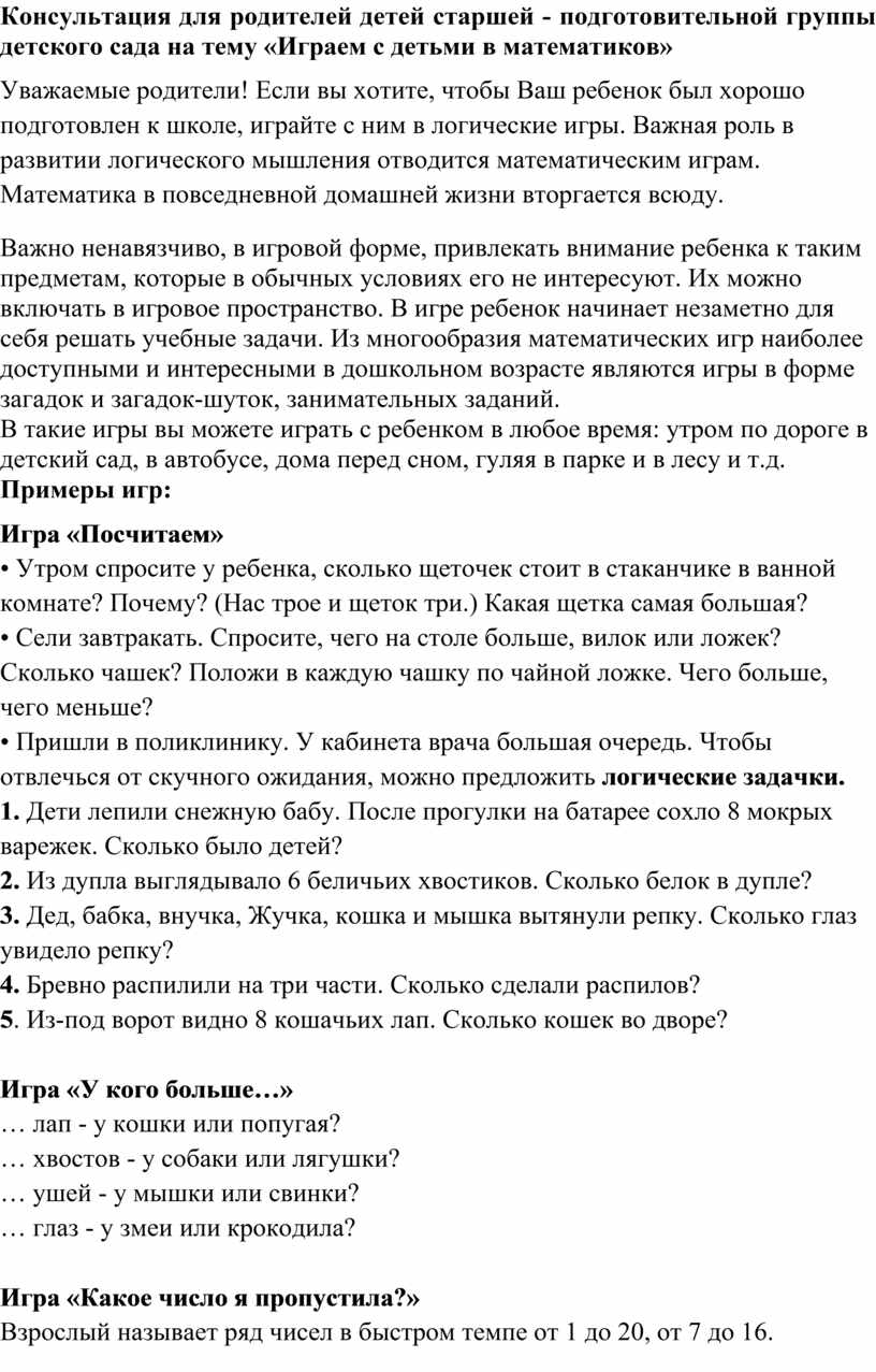 Консультация для родителей детей старшей - подготовительной группы детского сада на тему «Играем с детьми в математиков»