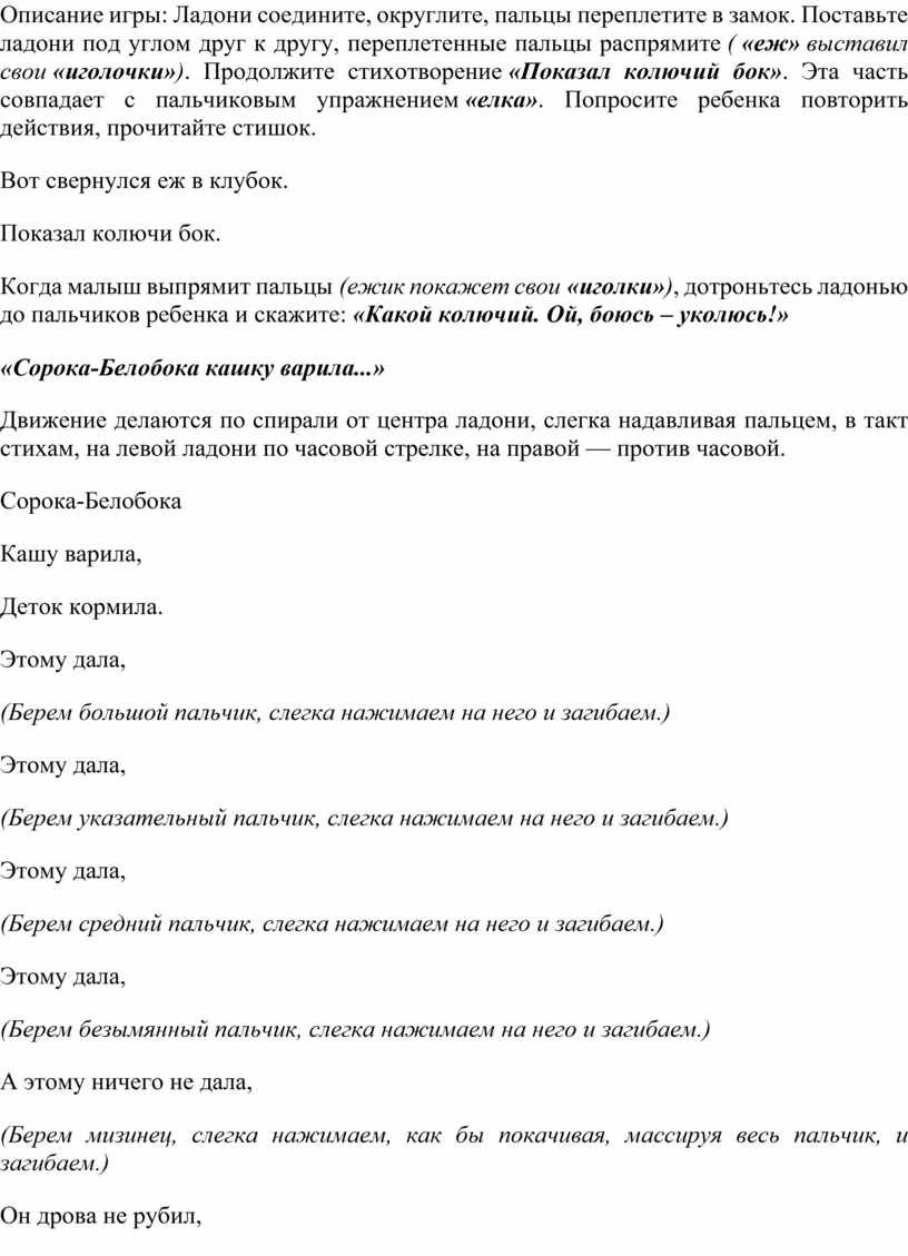 Описание игры: Ладони соедините, округлите, пальцы переплетите в замок. Поставьте ладони под углом друг к другу, переплетенные пальцы распрямите ( «еж» выставил свои «иголочки»). Продолжите стихотворение «Показал колючий бок». Эта часть совпадает с пальчиковым упражнением «елка». Попросите ребенка повторить действия, прочитайте стишок.