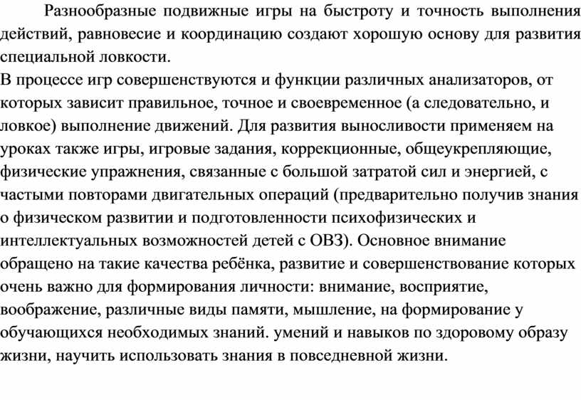 Через игры воспитываются интерес к движениям, потребность в подвижных видах деятельности. Особое внимание уделяется развитию двигательных умений и навыков. Малоподвижность следует рассматривать как серьёзный недостаток поведения ребёнка. Применение игровой деятельности, в силу присущих ей особенностей, является способом комплексного совершенствования двигательной деятельности. Подвижная игра выступает как комплексное упражнение, заставляющее, к тому же, активно работать мысль ребёнка. Хорошо освоенные движения являются предпосылками для развития координационных способностей. Разнообразные подвижные игры на быстроту и точность выполнения действий, равновесие и координацию создают хорошую основу для развития специальной ловкости.