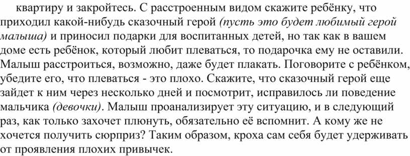 Ещё одним хорошим методом в борьбе с привычкой плеваться у ребёнка могут быть разыгрывание ситуаций. Когда малыш будет отвлечен, тихонько откройте входную дверь и позвоните в звонок, а затем быстро зайдите в квартиру и закройтесь. С расстроенным видом скажите ребёнку, что приходил какой-нибудь сказочный герой (пусть это будет любимый герой малыша) и приносил подарки для воспитанных детей, но так как в вашем доме есть ребёнок, который любит плеваться, то подарочка ему не оставили. Малыш расстроиться, возможно, даже будет плакать. Поговорите с ребёнком, убедите его, что плеваться - это плохо. Скажите, что сказочный герой еще зайдет к ним через несколько дней и посмотрит, исправилось ли поведение мальчика (девочки). Малыш проанализирует эту ситуацию, и в следующий раз, как только захочет плюнуть, обязательно её вспомнит. А кому же не хочется получить сюрприз? Таким образом, кроха сам себя будет удерживать от проявления плохих привычек.
