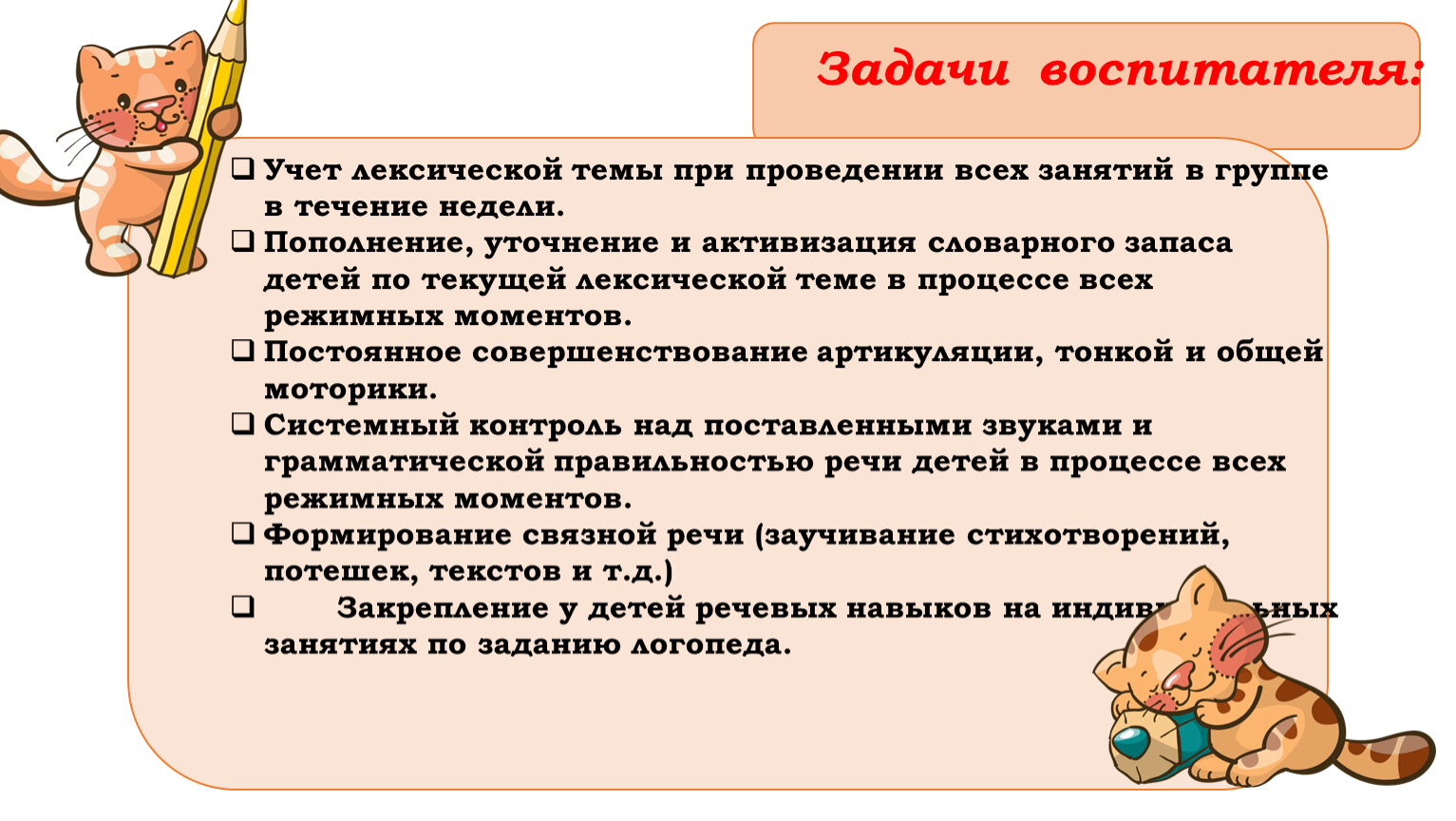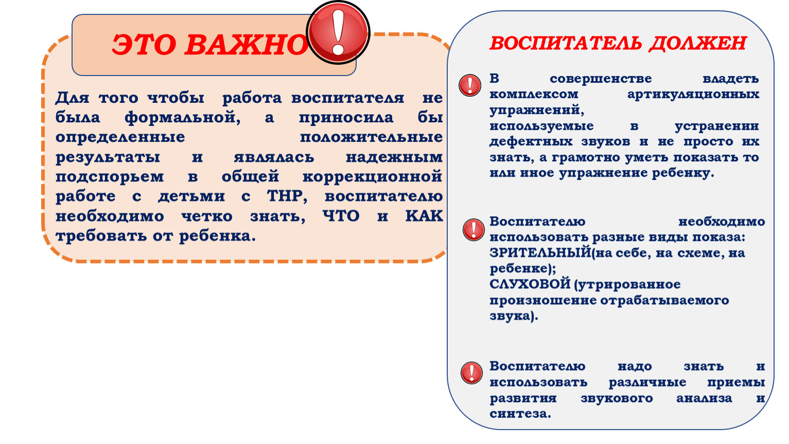 Для того чтобы работа воспитателя не была формальной, а приносила бы определенные положительные результаты и являлась надежным подспорьем в общей коррекционной работе с детьми с ТНР, воспитателю необходимо четко знать, ЧТО и КАК требовать от ребенка.