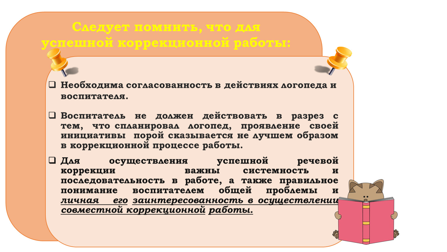Для   осуществления   успешной   речевой   коррекции   важны системность и последовательность в работе, а также правильное понимание   воспитателем   общей   проблемы   и   личная   его заинтересованность в осуществлении совместной коррекционной работы.