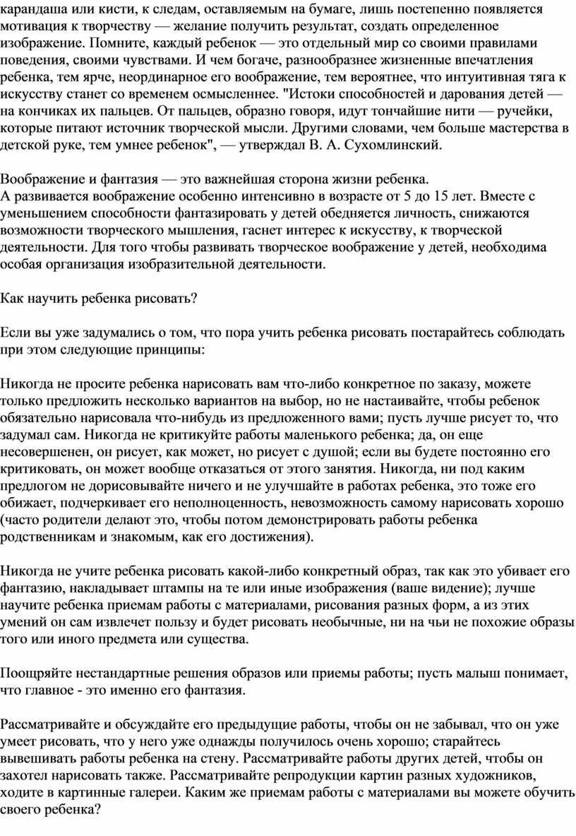 В процессе изобразительной деятельности сочетается умственная и физическая активность ребенка. Для создания рисунка необходимо приложить усилия, потрудиться, овладевая определенными умениями. Сначала у детей возникает интерес к движению карандаша или кисти, к следам, оставляемым на бумаге, лишь постепенно появляется мотивация к творчеству — желание получить результат, создать определенное изображение. Помните, каждый ребенок — это отдельный мир со своими правилами поведения, своими чувствами. И чем богаче, разнообразнее жизненные впечатления ребенка, тем ярче, неординарное его воображение, тем вероятнее, что интуитивная тяга к искусству станет со временем осмысленнее. "Истоки способностей и дарования детей — на кончиках их пальцев. От пальцев, образно говоря, идут тончайшие нити — ручейки, которые питают источник творческой мысли. Другими словами, чем больше мастерства в детской руке, тем умнее ребенок", — утверждал В. А. Сухомлинский.