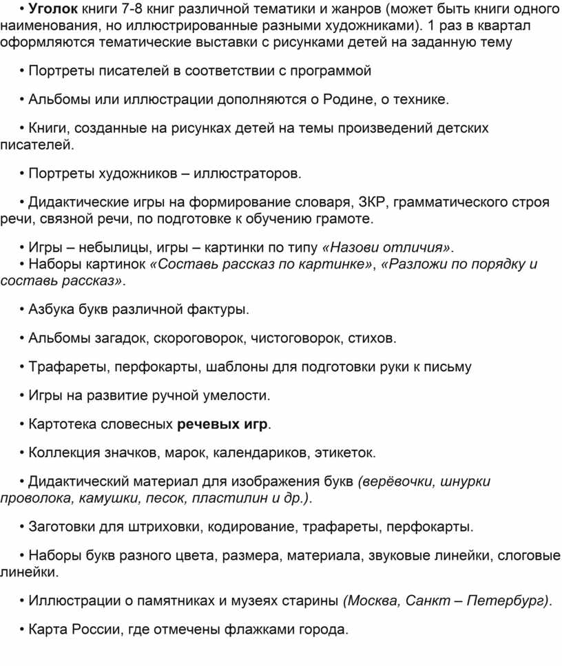 • Уголок книги 7-8 книг различной тематики и жанров (может быть книги одного наименования, но иллюстрированные разными художниками). 1 раз в квартал оформляются тематические выставки с рисунками детей на заданную тему