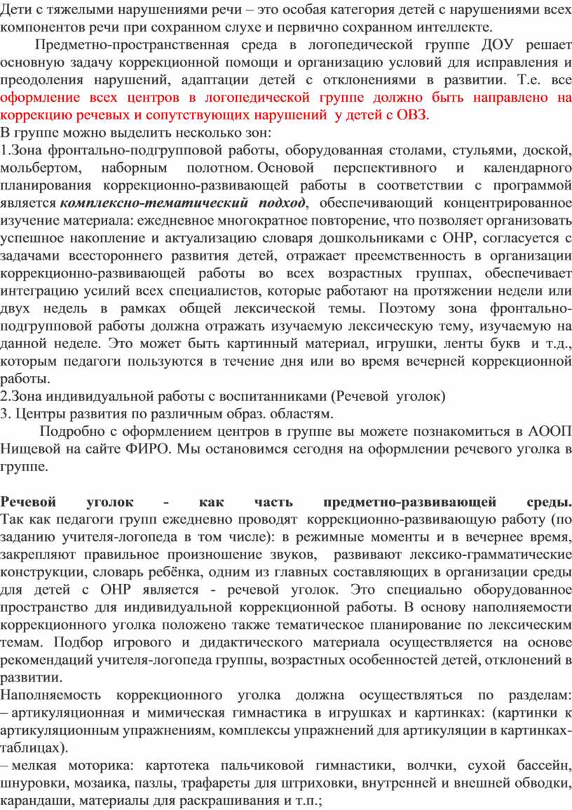 Предметно-пространственная среда в логопедической группе ДОУ решает основную задачу коррекционной помощи и организацию условий для исправления и преодоления нарушений, адаптации детей с отклонениями в развитии. Т.е. все оформление всех центров в логопедической группе должно быть направлено на коррекцию речевых и сопутствующих нарушений у детей с ОВЗ.