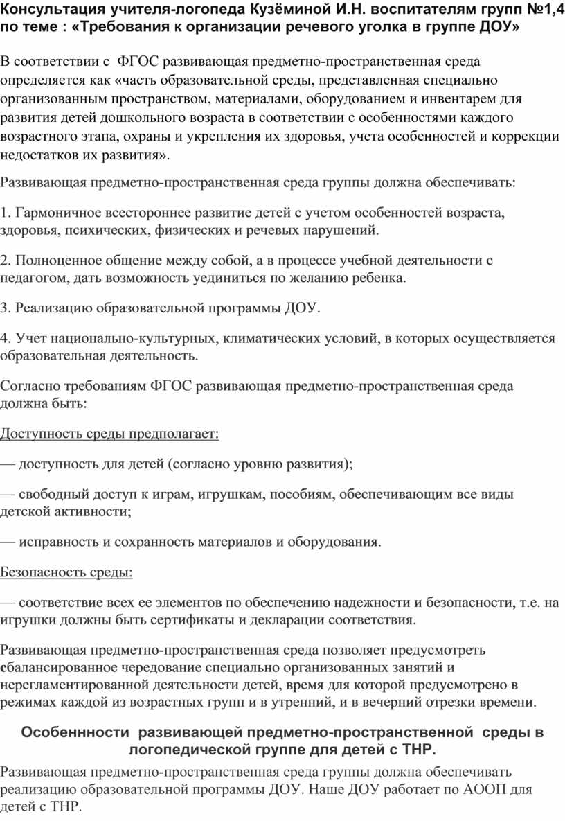 Консультация учителя-логопеда Кузёминой И.Н. воспитателям групп №1,4 по теме : «Требования к организации речевого уголка в группе ДОУ»