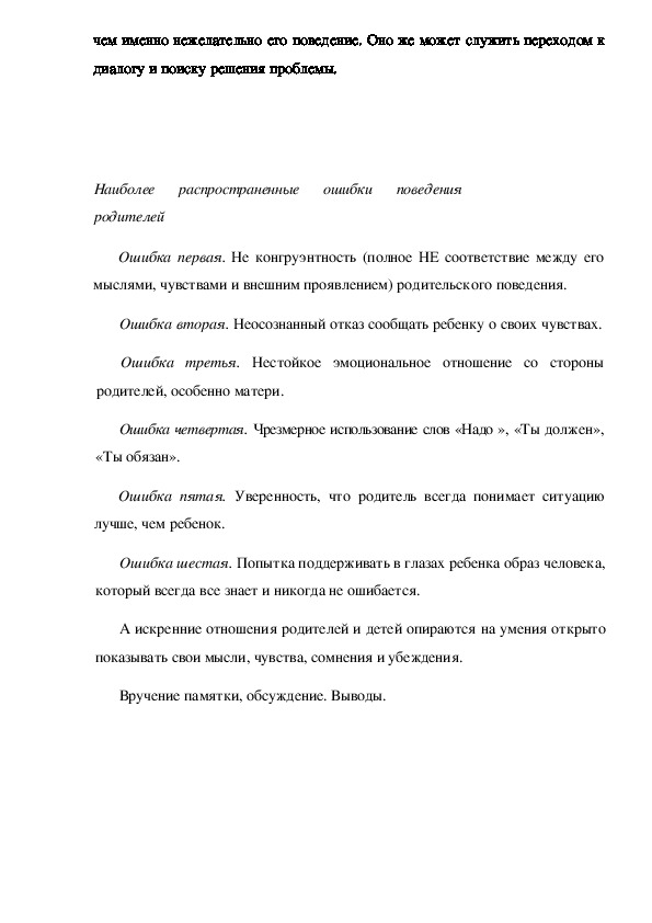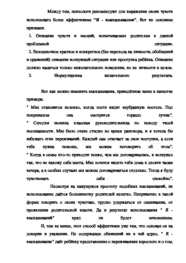 высказывание" даёт ребёнку представление о переживаниях взрослого и о том,чем именно нежелательно его поведение. Оно же может служить переходом к