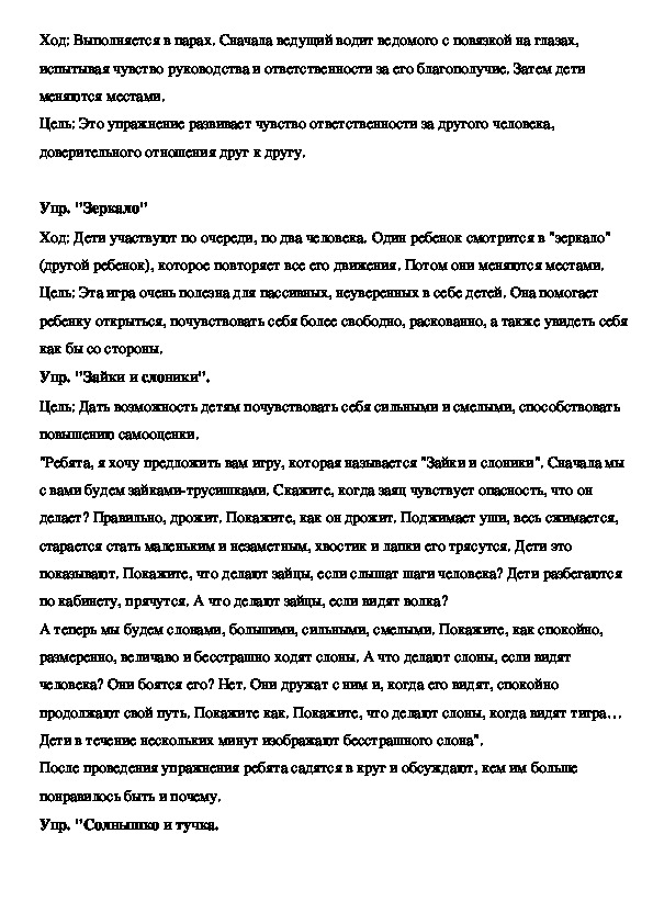 Упр. "Поводырь".Ход: Выполняется в парах. Сначала ведущий водит ведомого с повязкой на глазах,