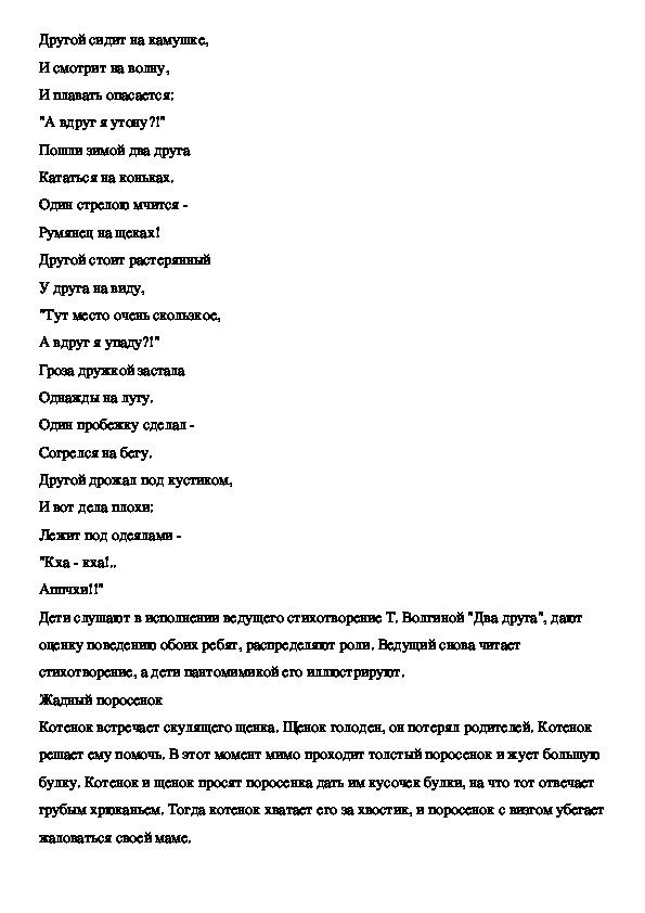 Дети слушают в исполнении ведущего стихотворение Т. Волгиной "Два друга", дают