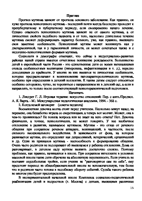 В консультации для педагогов - Мутизм, говорится о том, что временное исчезновение речи под влиянием различных вредностей (чаще всего неблагоприятных психических воздействий) называется мутизмом. Мутизм и сурдомутизм относят к невротическим нарушениям речи. Мутизм имеет различную выраженность и нозологическую окраску. Мутизм встречается у девочек примерно в 2 раза чаще, чем у мальчиков; он обычно возникает в тех семьях, в которых уже имеется массивная наследственная отягощенность речевыми расстройствами; у тех, кто в дальнейшем заболевает психогенным мутизмом, имеются задержки речевого развития и различные другие дефекты речевой функции; в семьях таких детей обнаруживаются длительные и напряженные конфликты, отрицательный психологический климат;В консультации для педагогов - Мутизм, говорится о том, что временное исчезновение речи под влиянием различных вредностей (чаще всего неблагоприятных психических воздействий) называется мутизмом. Мутизм и сурдомутизм относят к невротическим нарушениям речи. Мутизм имеет различную выраженность и нозологическую окраску. Мутизм встречается у девочек примерно в 2 раза чаще, чем у мальчиков; он обычно возникает в тех семьях, в которых уже имеется массивная наследственная отягощенность речевыми расстройствами; у тех, кто в дальнейшем заболевает психогенным мутизмом, имеются задержки речевого развития и различные другие дефекты речевой функции; в семьях таких детей обнаруживаются длительные и напряженные конфликты, отрицательный психологический климат;