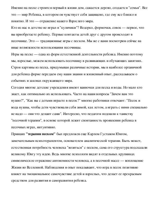 В консультации для педагогов - Песочная игротерапия с дошкольниками, говорится о том, что это игры, направленные на развитие тактильно-кинестетической чувствительности и мелкой моторики рук. Игры на песке — одна из форм естественной деятельности ребенка. Именно поэтому мы, взрослые, можем использовать песочницу в развивающих и обучающих занятиях. Строя картины из песка, придумывая различные истории, мы в наиболее органичной для ребенка форме передаем ему наши знания и жизненный опыт, рассказываем о событиях и законах окружающего мира.В консультации для педагогов - Песочная игротерапия с дошкольниками, говорится о том, что это игры, направленные на развитие тактильно-кинестетической чувствительности и мелкой моторики рук. Игры на песке — одна из форм естественной деятельности ребенка. Именно поэтому мы, взрослые, можем использовать песочницу в развивающих и обучающих занятиях. Строя картины из песка, придумывая различные истории, мы в наиболее органичной для ребенка форме передаем ему наши знания и жизненный опыт, рассказываем о событиях и законах окружающего мира.