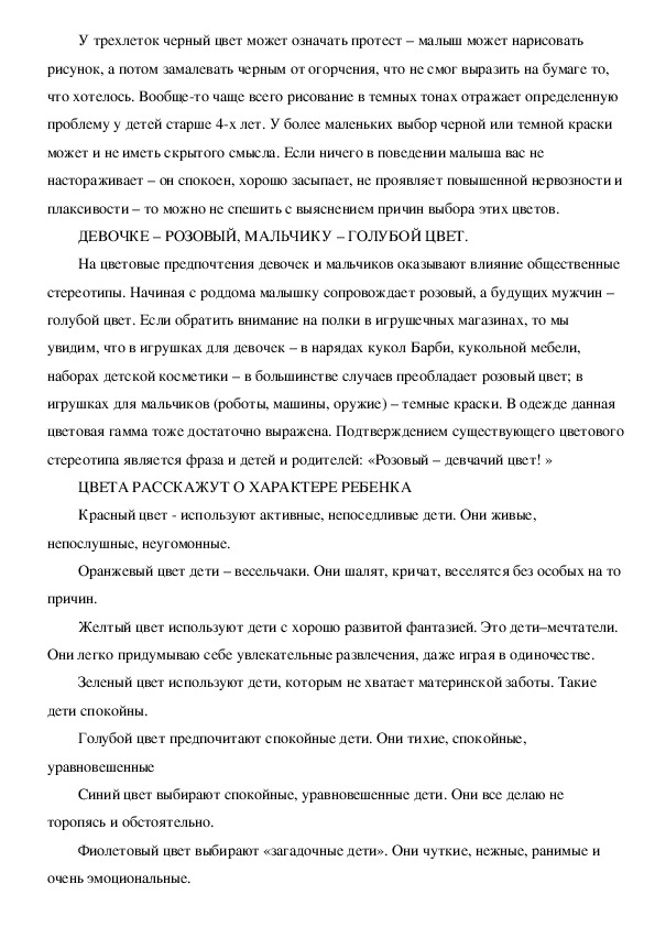ребенка – он выбирает наиболее контрастный цвет.У трехлеток черный цвет может означать протест – малыш может нарисовать