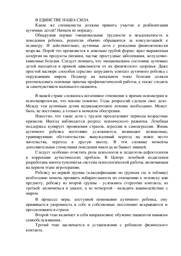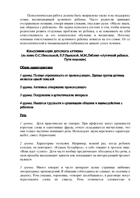 (по книге О.С.Никольской, Е.Р.Баенской, М.М.Либлинг «Аутичный ребенок.
