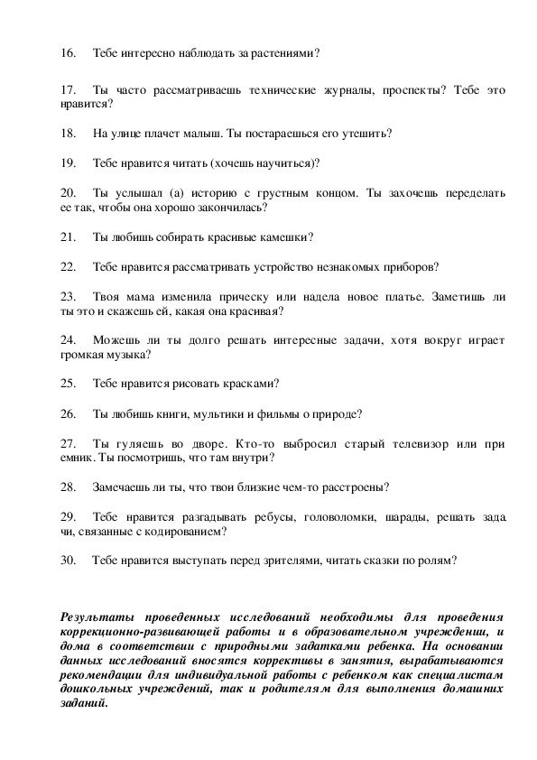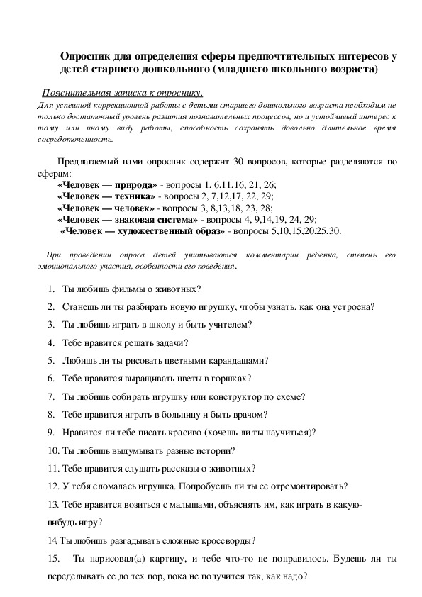 Предлагаемый нами опросник содержит 30 вопросов, которые разделяются по
