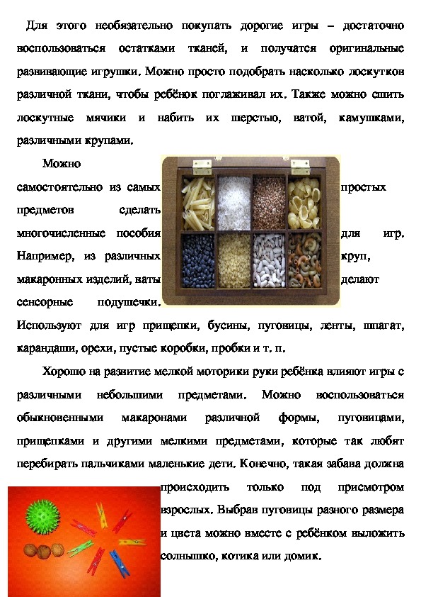 Используют для игр прищепки, бусины, пуговицы, ленты, шпагат,