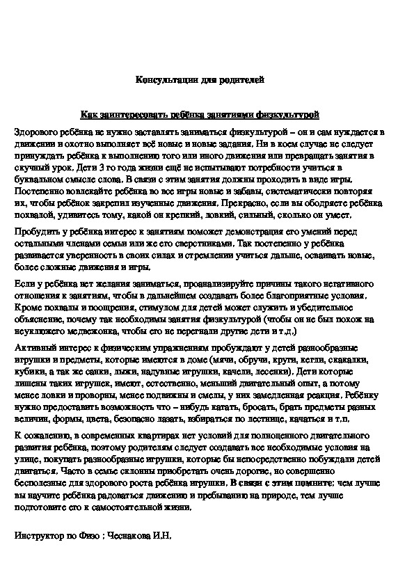 Инструктор по Физо:Чеснакова И.Н.Консультации для родителей