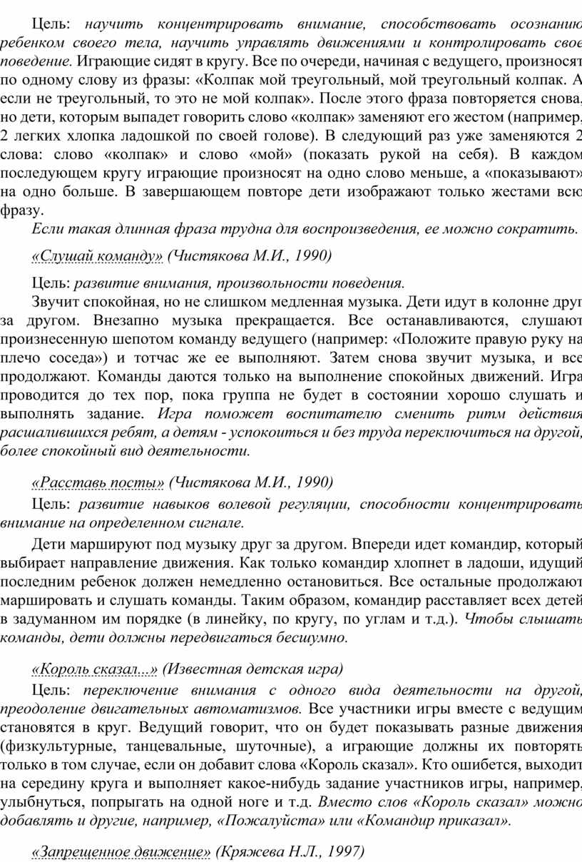 Цель: переключение внимания с одного вида деятельности на другой, преодоление двигательных автоматизмов. Все участники игры вместе с ведущим становятся в круг. Ведущий говорит, что он будет показывать разные движения (физкультурные, танцевальные, шуточные), а играющие должны их повторять только в том случае, если он добавит слова «Король сказал». Кто ошибется, выходит на середину круга и выполняет какое-нибудь задание участников игры, например, улыбнуться, попрыгать на одной ноге и т.д. Вместо слов «Король сказал» можно добавлять и другие, например, «Пожалуйста» или «Командир приказал».