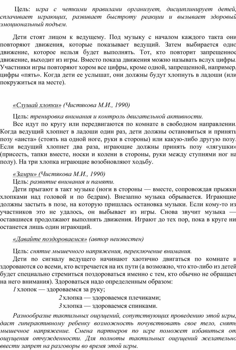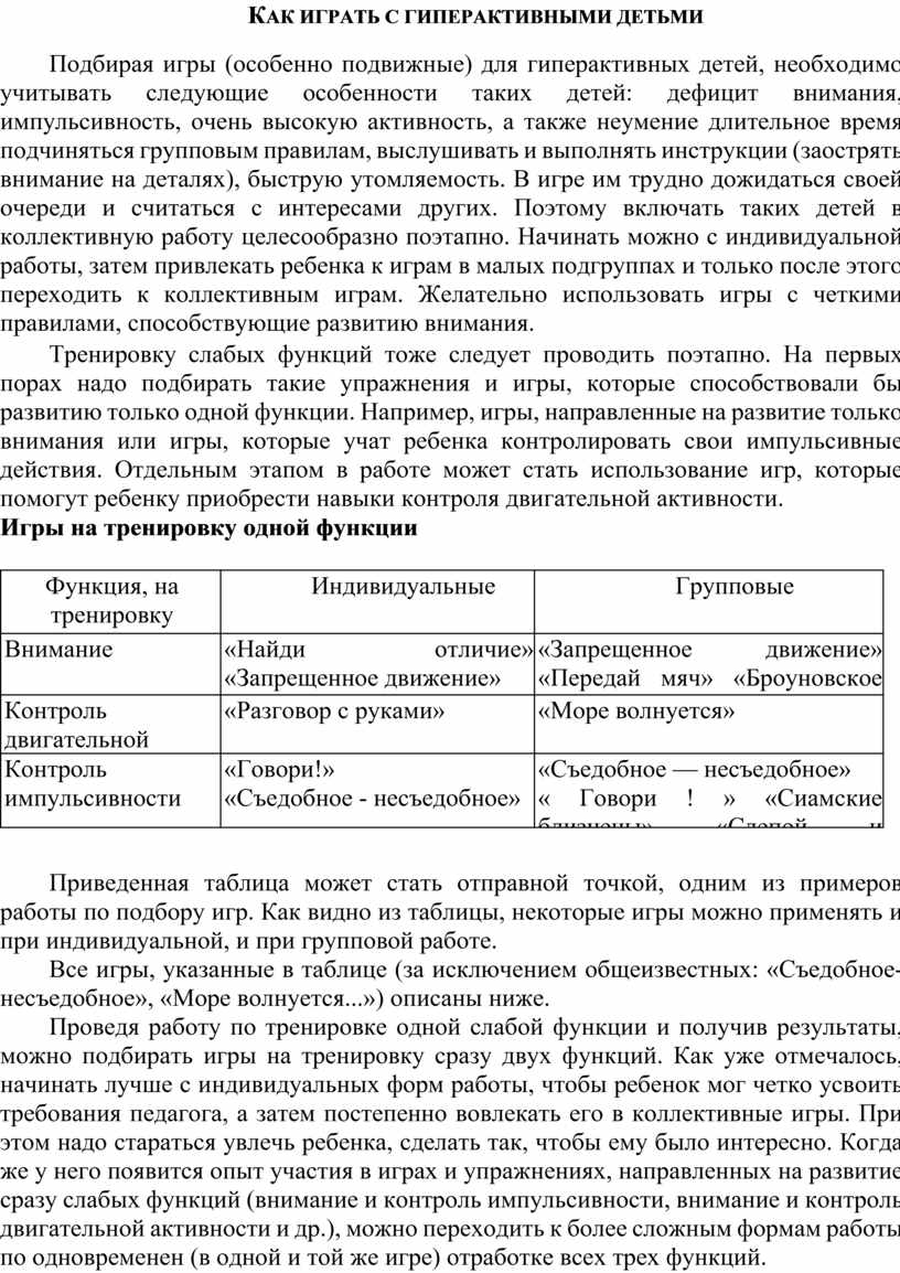 Подбирая игры (особенно подвижные) для гиперактивных детей, необходимо учитывать следующие особенности таких детей: дефицит внимания, импульсивность, очень высокую активность, а также неумение длительное время подчиняться групповым правилам, выслушивать и выполнять инструкции (заострять внимание на деталях), быструю утомляемость. В игре им трудно дожидаться своей очереди и считаться с интересами других. Поэтому включать таких детей в коллективную работу целесообразно поэтапно. Начинать можно с индивидуальной работы, затем привлекать ребенка к играм в малых подгруппах и только после этого переходить к коллективным играм. Желательно использовать игры с четкими правилами, способствующие развитию внимания.