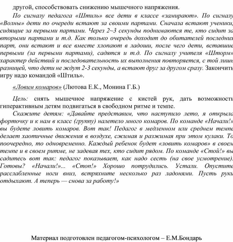 Скажите детям: «Давайте представим, что наступило лето, я открыла форточку и к нам в класс (группу) налетело много комаров. По команде «Начали!» вы будете ловить комаров. Вот так! Педагог в медленном или среднем темпе делает хаотичные движения в воздухе, сжимая и разжимая при этом кулаки. То поочередно, то одновременно. Каждый ребенок будет «ловить комаров» в своем темпе и в своем ритме, не задевая тех, кто сидит рядом. По команде «Стой!» вы садитесь вот так: педагог показывает, как надо сесть (на свое усмотрение). Готовы? «Начали!»... «Стоп!» Хорошо потрудились. Устали. Опустите расслабленные ноги вниз, встряхните несколько раз ладонями. Пусть руки отдыхают. А теперь — снова за работу!»