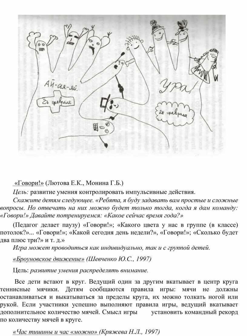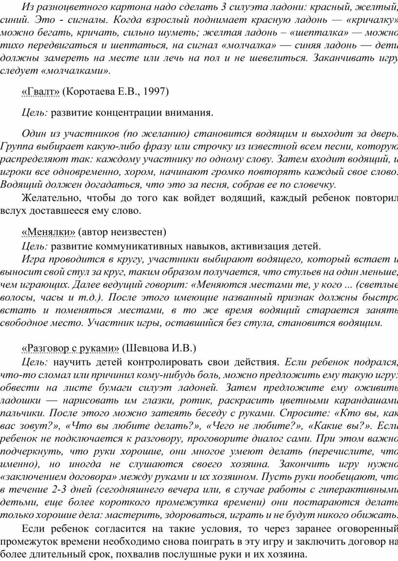 Цель: научить детей контролировать свои действия. Если ребенок подрался, что-то сломал или причинил кому-нибудь боль, можно предложить ему такую игру: обвести на листе бумаги силуэт ладоней. Затем предложите ему оживить ладошки — нарисовать им глазки, ротик, раскрасить цветными карандашами пальчики. После этого можно затеять беседу с руками. Спросите: «Кто вы, как вас зовут?», «Что вы любите делать?», «Чего не любите?», «Какие вы?». Если ребенок не подключается к разговору, проговорите диалог сами. При этом важно подчеркнуть, что руки хорошие, они многое умеют делать (перечислите, что именно), но иногда не слушаются своего хозяина. Закончить игру нужно «заключением договора» между руками и их хозяином. Пусть руки пообещают, что в течение 2-3 дней (сегодняшнего вечера или, в случае работы с гиперактивными детьми, еще более короткого промежутка времени) они постараются делать только хорошие дела: мастерить, здороваться, играть и не будут никого обижать.