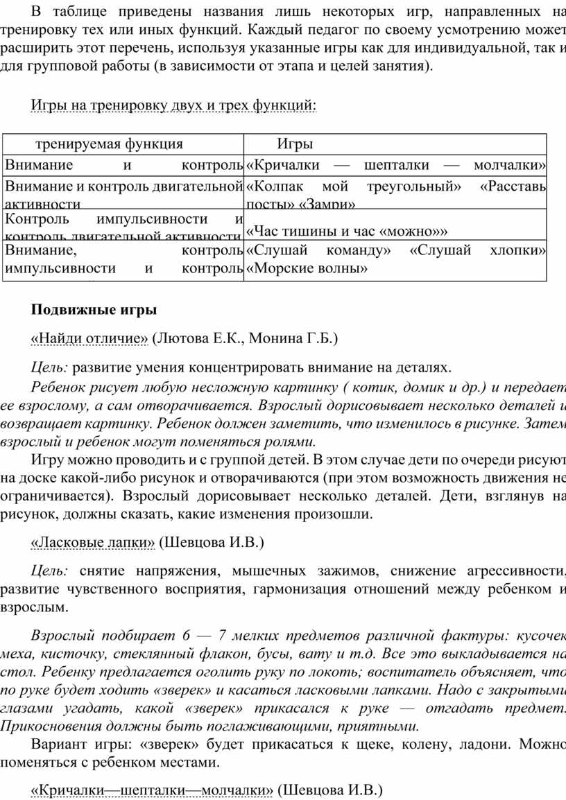 В таблице приведены названия лишь некоторых игр, направленных на тренировку тех или иных функций. Каждый педагог по своему усмотрению может расширить этот перечень, используя указанные игры как для индивидуальной, так и для групповой работы (в зависимости от этапа и целей занятия).