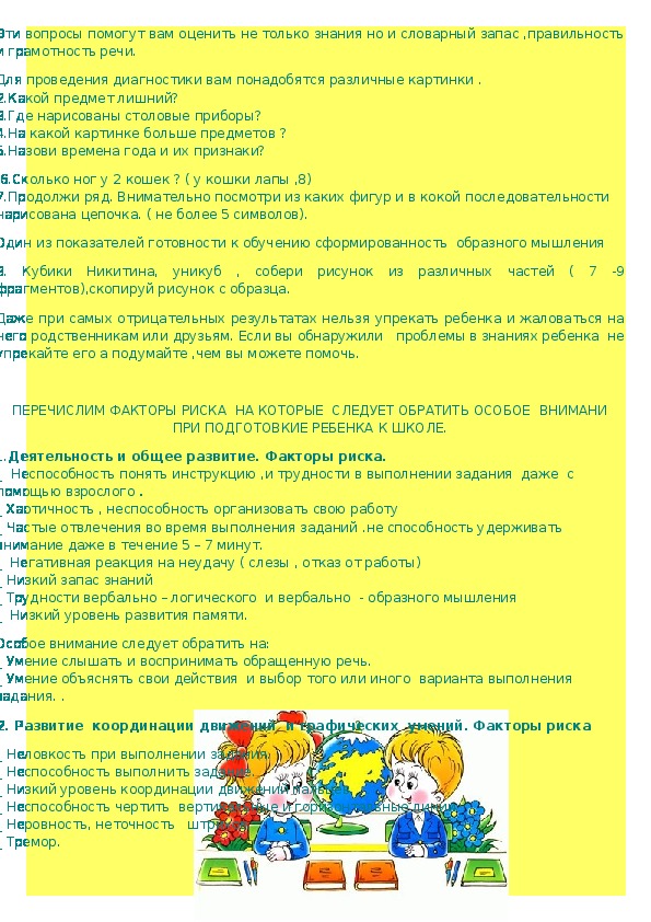 В данной консультации содержаться информация о показателях готовности ребёнка к школе:умение регулировать свое поведение,мотивационная готовность, интелектуальная готовность. Родителям предлагается список заданий для самостоятельной проверки знаний ребенка. Так же перечислены факторы риска на которые следует обратить вниманиесли при подготовке ребёнка к школе. Подобраны упражнения для развития произвольной внимания, памяти, мышления, восприятия, воображения, мелкой моторики.